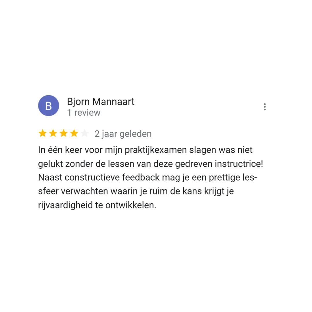 Of je nu nog nooit hebt gereden of al eerder rijles hebt gehad maar het lastig vindt om vertrouwen op te bouwen — wij helpen je stap voor stap. We creëren een veilige sfeer waarin jij je op je gemak voelt.